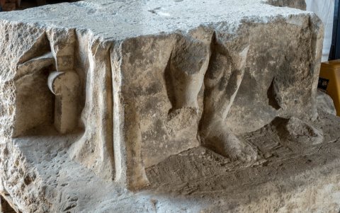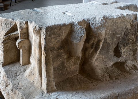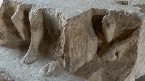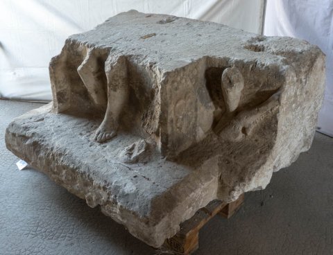 - Mythische Figur: in der vorspringenden Mittelnische Beine des Hercules, neben dem linken Fuß Ansatz der Keule. Auf der rechten Außenseite der Nische Weinranke, anschließend zurückspringendes Bildfeld mit einem rechten menschlichen Bein und Vorderbein eines Hirschs (Hercules im Kampf mit der Hirschkuh ?). Auf der linken Außenseite der Mittelnische Baumstamm, in der Ecke kleiner Pfeiler und Peltenschild (?).