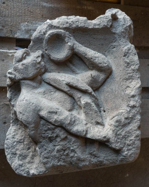 - Eckblock. Mythische Figuren: auf einer Seite nach rechts hin bewegte Figur mit wehendem Mantel (Mänade ?), auf der links anschließenden Seite jugendlicher Satyr mit Schallbecken (Kymbala).