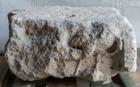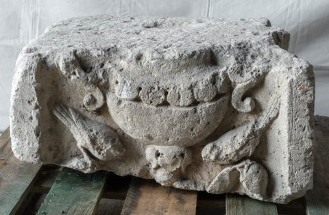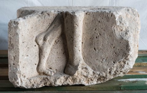 - Auf der Vorderseite nackte Füße und Unterschenkel eines nach rechts gehenden Mannes. Auf der linken Nebenseite Krater zwischen Vögeln, auf der rechten Reiher mit nach unten gebogenem Hals, restliches Relief abgeschlagen.