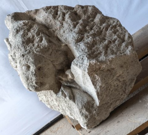 - Mythische Figur: nach rechts gedrehter weiblicher Kopf mit Helm. Minerva (?).