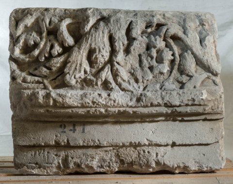 - Akanthusrankenfries mit Blüten, darunter profilierter Rahmen und Fascien. Architrav eines Rundbaus.