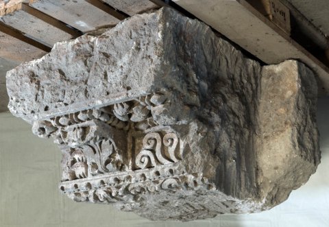 - Konsolgesims. Auf den Konsolen Akanthusblätter, dazwischen Felder mit Spiralhaken und Blättern, Kassetten mit Astragalstab-Rahmen und Rosetten.
