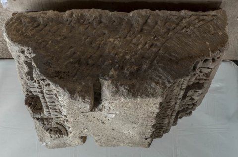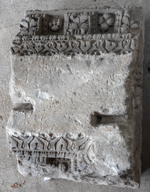 - Epistyl mit Konsolgesims (Blattkyma, Blattstab, Akanthus-Konsolen, dazwischen alternierend Spiralhaken und Blätter. Kassetten mit Rosetten mit Astragalstab gerahmt) auf beiden Seiten, auf einer Seite innere Ecke erhalten.