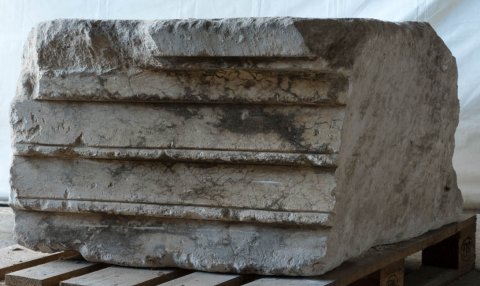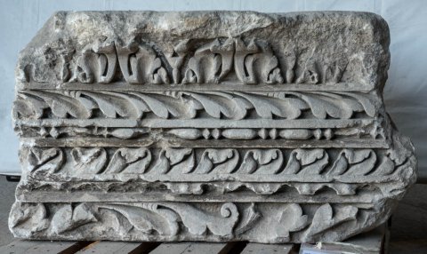 - Epistyl, auf der Außenseite ornamentierte Profile (Blattkyma, Blattfries, Perlstab, Blattkyma, Blätterfries), auf der Innenseite glatte Fasciengliederung.