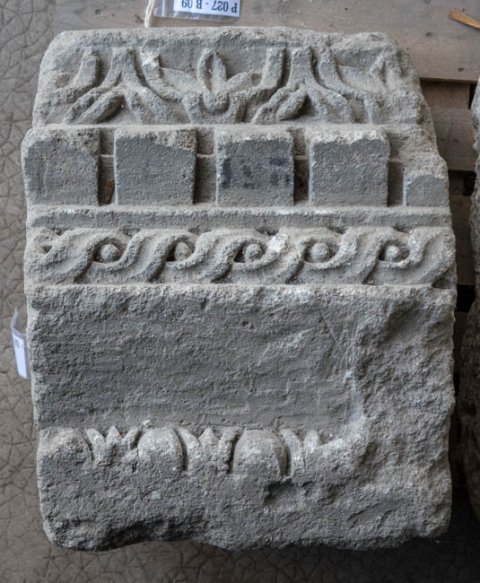 - Gesims mit Blattkyma, Zahnschnitt, Flechtband. Etwas zurückversetzt auf der Unterseite Reste eines Eierstabes.