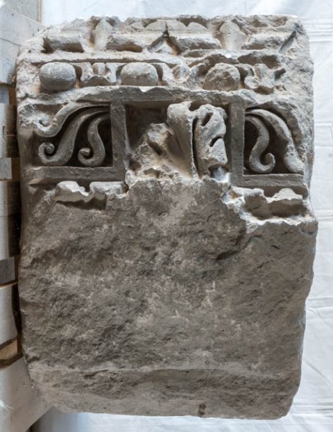 - Konsolgesims mit Blattkonsolen, dazwischen Felder mit Halbpalmetten, darüber Eierstab und Blattkyma.