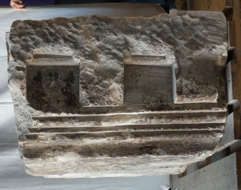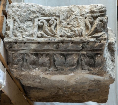 - Konsolgesims. Auf der Außenseite mit Blattkyma, Blattstab, Felder mit Halbpalmetten zwischen den (abgearbeiteten) Konsolen. Auf der Innenseite glattes Profil.