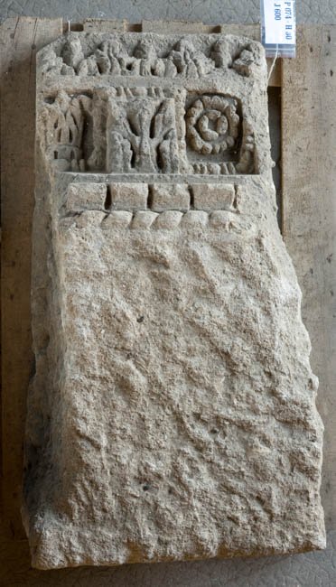 - Konsolgesims mit Blattkonsolen, dazwischen Felder mit Rosetten und Blattkelchen, oben Blattkyma, unten Zahnschnitt und tordiertes Band.