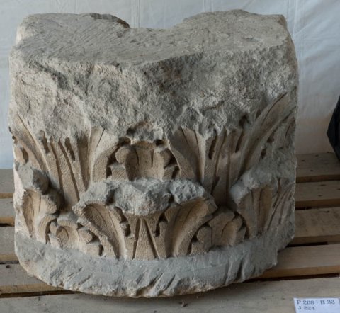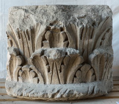 - Kapitell mit zwei Akanthusblattkränzen, unten tordierter Wulst.