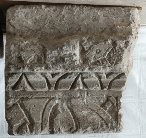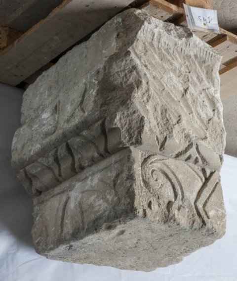 - links, hinten u. unten abgeschnitten, Gesimsprofil großteils abgearbeitet