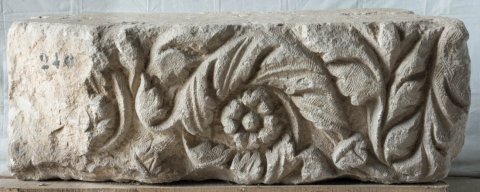 - auf der Vorderseite Rankenfries mit Blüte, auf der linken Nebenseite Waffen (Schilde)