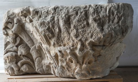 - Korinthisches Kapitell einer Halbsäule, links anschließend Reliefreste (Ranken, Blätter)
