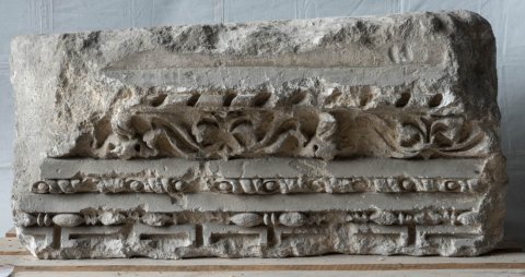 - Gesims mit Palmettenfries, Architrav mit Flechtband, Astragalstab, Mäanderband (?)