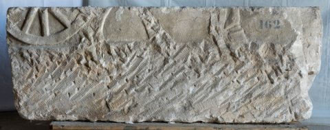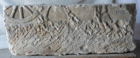 - Eckblock. Wagenszene: Rad mit Speichen, rechts davon Beine eines Pferdes. Auf der rechten Nebenseite Rest eines Ornaments.