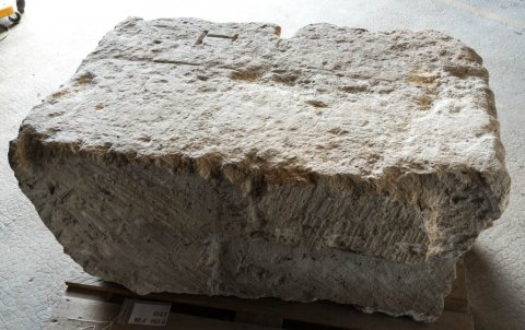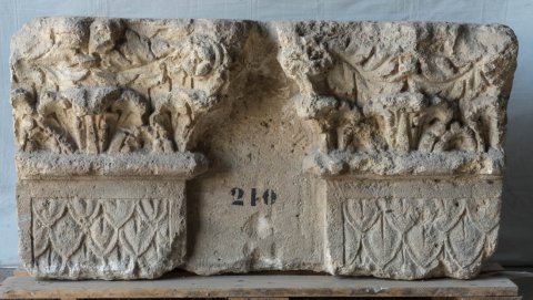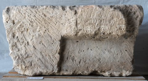 - Zwei flache Pilaster mit Schuppenmuster und korinthischem Kapitell, dazwischen Wandfläche. Auf der Rückseite Pilaster und oberer Rahmen abgearbeitet. In der Oberseite eingravierter Buchstabe L.