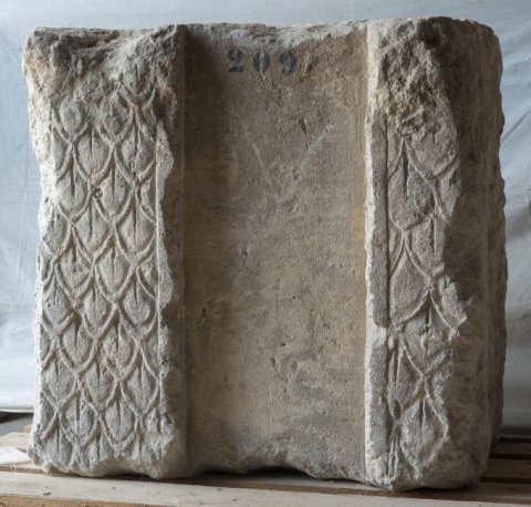- Zwei Pilaster mit Schuppenmuster, dazwischen glatte Wand.