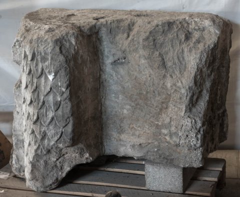 - Halbsäule mit Schuppenmuster, seitlich glatte Wand