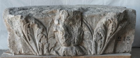 - Pilasterkapitell mit Akanthusblättern, dazwischen Blattkelch mit Kinderbüste (? rechter Arm sichtbar ?)