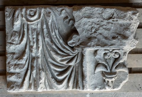 - Rechts ornamentierter Pilaster mit abgeschlagenem Kapitell, rechts davon Ansatz einer Bogennische mit Rest von Porträtrelief; links des Pilasters Wand mit aufgehängter Draperie und Tänien.
