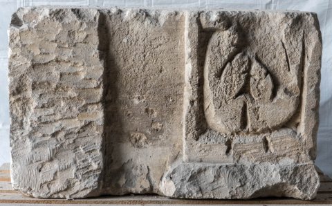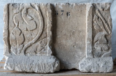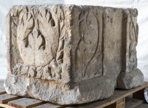 - Ante mit Pilastergliederung. Auf der Stirnseite und links anschließender Seite jeweils Blattkelch, auf der rechten Seite Pilaster mit Blattpflanzen.