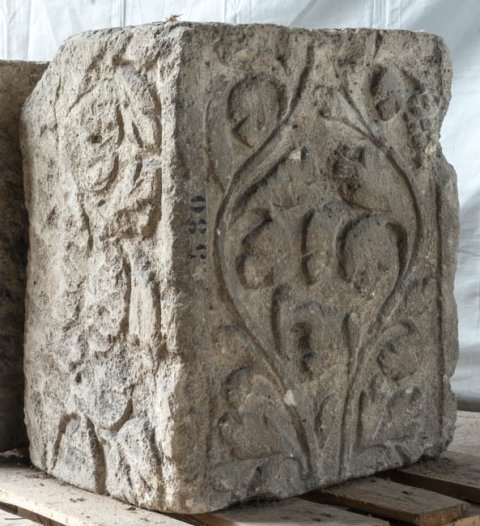 - Eckblock: auf Vorder- und linker Nebenseite Rankenreliefs