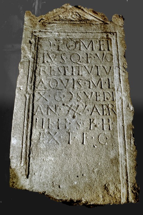 - Q(uintus) Pompei/{i}us Q(uinti) f(ilius) Vo(ltinia) / Restitutus / Aquis m(iles) l(egionis) / X G(eminae) |(centuria) Suedi / an(norum) XXV aer(um) / III h(ic) s(itus) e(st) h(eres) / ex t(estamento) f(aciendum) c(uravit)
