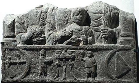 Im Hauptbild Familie: zwischen Säulen Brustbilder von drei Erwachsenen und einem Kind. Links Frau: Tunica, Mantel, in den Händen Weintraube. In der Mitte Frau: Tunica, Mantel, Armreif. Rechts Mann: Sagum mit Fransen, Fingerring. Vorn Knabe: Sagum, Scheibenfibel, in der Rechten Apfel.
