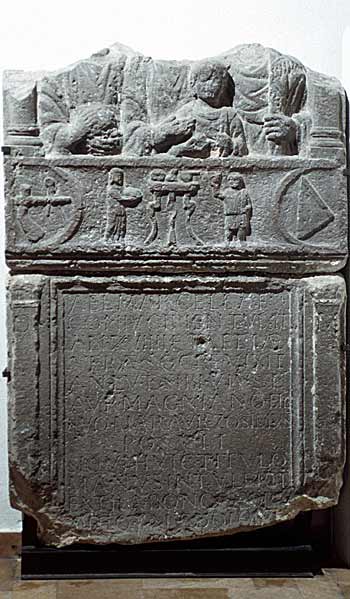 - D(is) M(anibus) // Ael(iae) Marcellae / coniugi pient(issimae) vixit / an(nos) XVIIII et Aeliae / Verae socr(a)e vixit / an(nos) LV et sibi viv(u)s et / Aur(elio) Magniano fil(io) / suo Mar(cus) Aur(elius) Zosimus / posuit / siqui huic titulo / manus intulerit / extra bonos mores / opto tale dolorem / [---]+AT+[-]V[---]