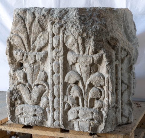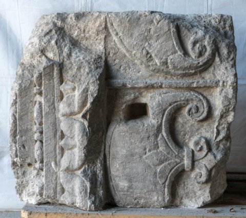 - Eckblock: auf der Vorderseite zwei Peltenschilde übereinander, getrennt durch eine Doppelaxt. Am linken Rand Profil mit Blattkyma und Astragalstab. auf der linken Nebenseite zwei vertikale Felder mit Blattkandelabern. Türgewände ?