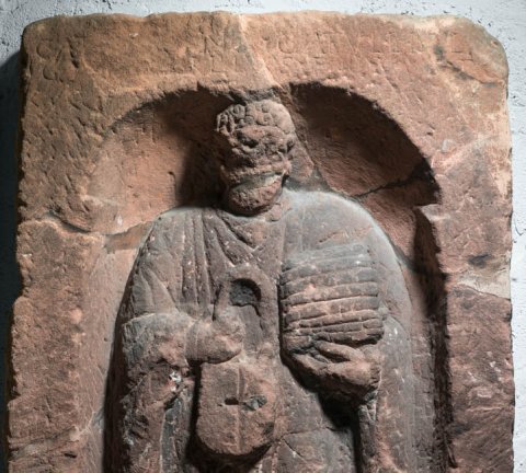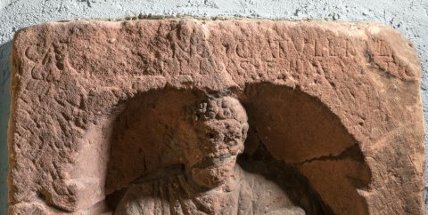 - Nische mit Muschelkonche, darin stehender bärtiger Mann in Ärmeltunica und Mantel, auf der linken Hand Korb, in der Rechten Tasche (?). Inschrift auf der oberen Rahmenleiste.