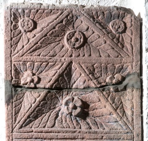 - Zwei eingeschriebene Giebel übereinander. In den Giebelfeldern und seitlichen Zwickeln jeweils Rosette vor Blättern.