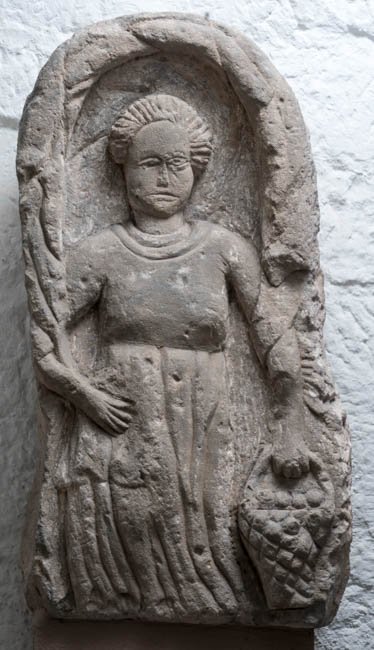 - Mythische Figur (?): stehende bekleidete Frau (Göttin ?) mit Henkelkob voller Früchte in der Linken. Im rechten Arm Zweig (?), um den linken Unterarm schlingt sich ein tordiertes Band, das das Relief oben bogenförmig rahmt.