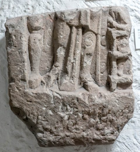 - Beine einer stehenden Frau (Göttin ?) in langem Gewand (Stola ?), zu ihrere Rechten balusterförmiger Altar oder Tischfuß. An ihrer linken Seite Regal (?), dahinter Reste einer kleineren Person (Kind ? Diener ?).