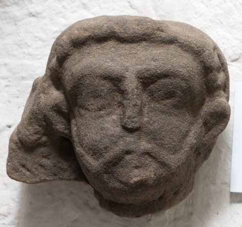 - Mythische Figur: bärtiger Kopf des Jupiter, erhobene rechte Hand an der rechten Kopfseite.