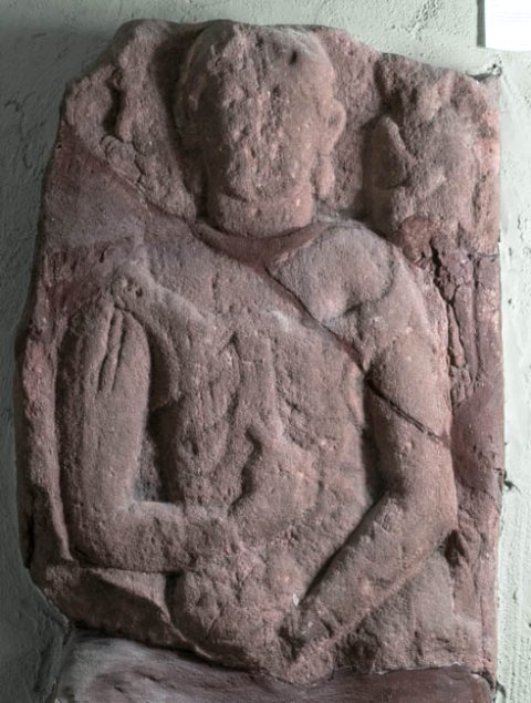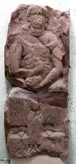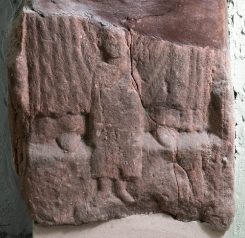 - Frontal sitzende Frau in Ärmeltunica und Obergewand (Stola ?), in der Rechten Fläschchen (?), in der Linken Schale mit Früchten. Vor ihr und neben beiden Schultern stehende kleinere Person (Kind ?). Frau mit Kindern ? Muttergöttin ?