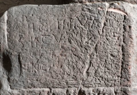 - 2 anpassende Fragmente, linke obere Ecke fehlt, Inschrift tlw. abgerieben