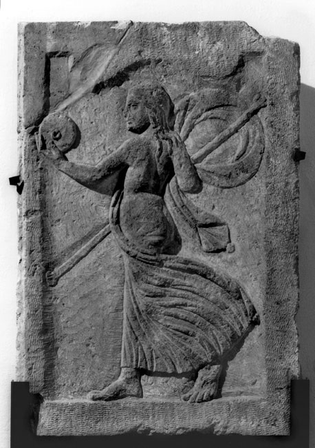 - Mythische Figur, Musikinstrument: Hochrechteckiges Bildfeld. Mänade in Rückenansicht, Körper entblößt, wehender Mantel, in der Rechten Thyrsosstab, in der Linken Tympanon.