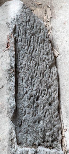 - Grabstein in Hausform mit steilem Satteldach, an der Vorderseite gerahmtes Schriftfeld.