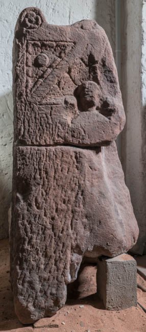 - Grabstein in Hausform mit steilem Satteldach, an der Vorderseite unten Bogenöffnung, oberhalb grob geglättete Zone, darüber Büste, die einen Giebel mit Blattdekor überschneidet. Zwickelfelder mit Blattrosette, auf den Ecken pulvini mit Rosette, Rest von Mittelakroter (?).