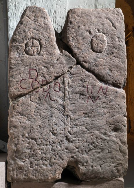 - Durch vertikale Leiste zweigeteilte Inschrift, oben links dachförmiger Abschluss, rechts horizontal. Unten in der Mitte Bogenöffnung.