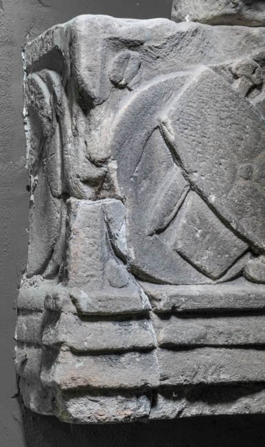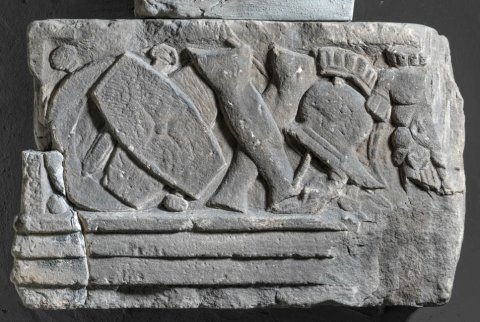 - Linke Ecke eines Architravs mit Waffenfries (Schilde, Schwerter, Beinschienen, Helm, Panzer) und Fascien.