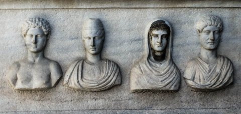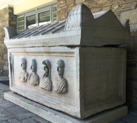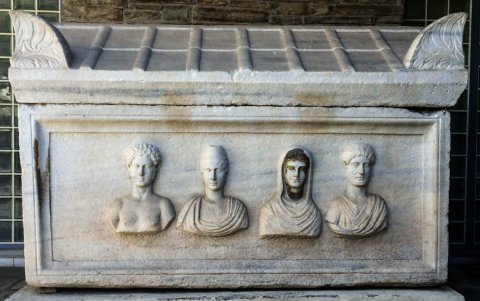 - Sarkophag mit dachförmigem Deckel mit Eckakroteren. Auf der gerahmten Vorderseite vier Porträtbüsten einer Familie. Von links: bartloser Mann, Frau in Chiton und Mantel, Frisur der Faustina maior, Frau mit über den Kopf gezogenem Mantel, bärtiger Mann in Chiton und Mantel.