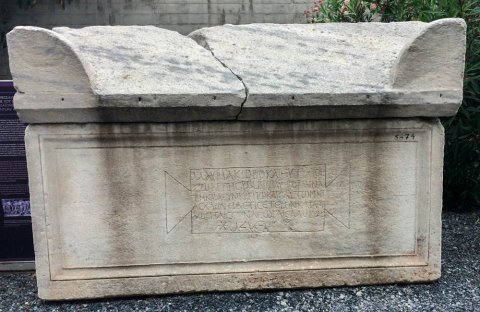 - Sarkophag mit dachförmigem Deckel mit glatten Eckakroteren, Kasten mit profiliertem Rahmen, darin geritzte tabula ansata mit der Inschrift.