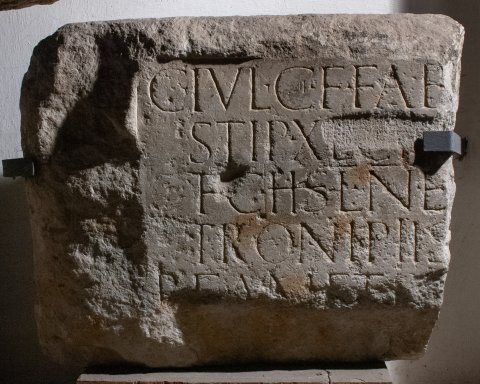 - C(aius) Iul(ius) C(ai) f(ilius) Fab(ia) [---] / stip(endiorum) XL C(aius) Iu]l(ius) --- h(eres)? ex? t(estamento)?] / f(aciendum) c(uravit) HS (sestertiis) L (milibus) n(ummorum) e[t --- iussu? pa]/troni piis[simi --- marmo?]/ream(?) et s+[---] / [---