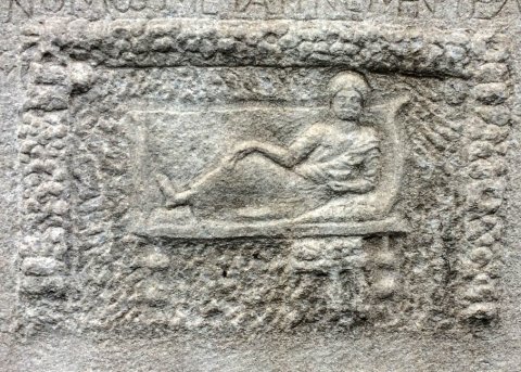 - Sarkophag mit dachförmigem Deckel mit Eckakroteren mit figürlichen Reliefs (Frau und Kind). Auf dem Kasten rahmenlose Inschrift und kleines rechteckiges Bildfeld, das in die Mitte der beiden letzten Inschriftzeilen geschoben ist. Totenmahl: auf Kline gelagerter bärtiger Mann mit Schale, vorn Tischchen.