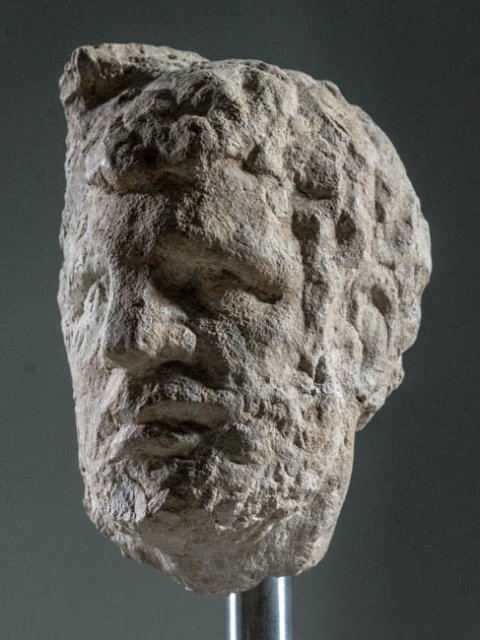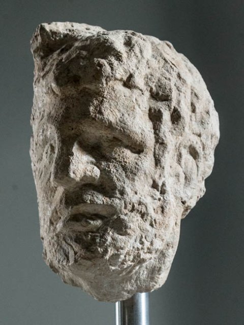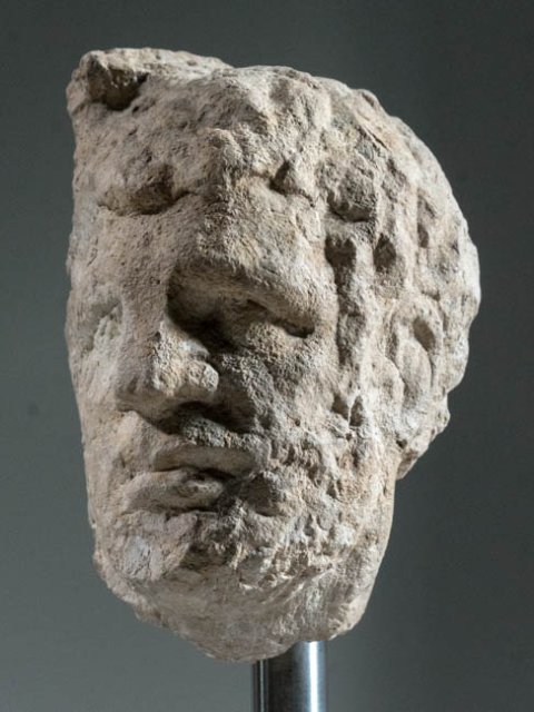 - unterlebensgroßer bärtiger Männerkopf, auf der rechten Seite des Oberkopfes ansetzende Hand ? Unterworfener Babar ?