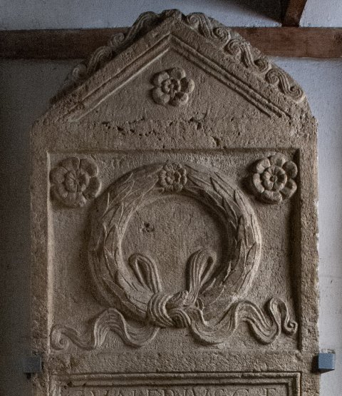 - Gerahmter Giebel mit Rosette, auf den Giebelschrägen Reihe von liegenden S-Haken mit Spiralenden. Im Hauptbild Kranz mit Clipeus und Tänien, drüber zwei Rosetten.