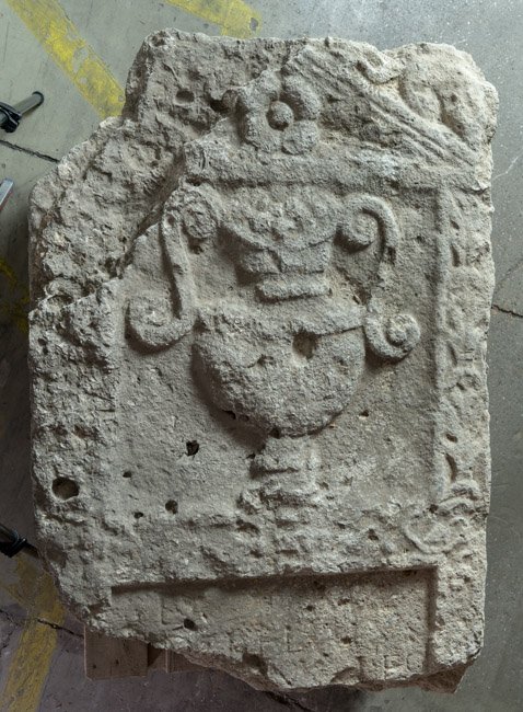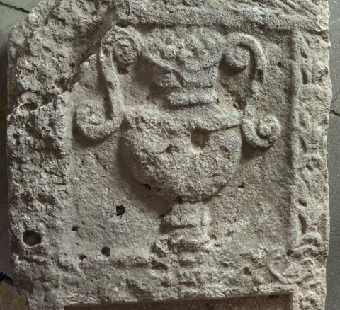 - Eingeschriebener Giebel mit Rosette, auf den Giebelschrägen Meerwesen. Im Bildfeld Volutenkrater mit Früchten, seitliche Rahmenleisten mit Blattornament.