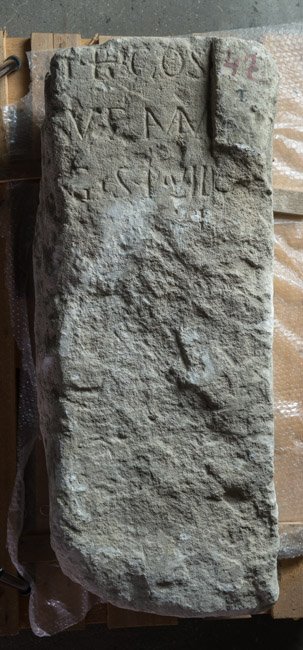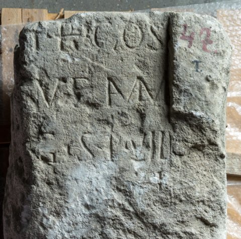 - oben u. links abgebr., unterer Teil der Inschrift abgeschlagen