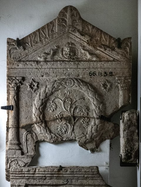 - Giebel mit Palmettenakroteren zwischen Zierleisten mit S-Spiralen, im gerahmten Giebelfeld Gorgoneion zwischen Delphinen. Im Hauptbild Kranz mit Clipeus und Tänien, darin Weinranke, oben Rosetten. Seitlich Säulen mit Blattkapitell. Auf der Sockelleiste unter dem Hauptbild Efeuranke.